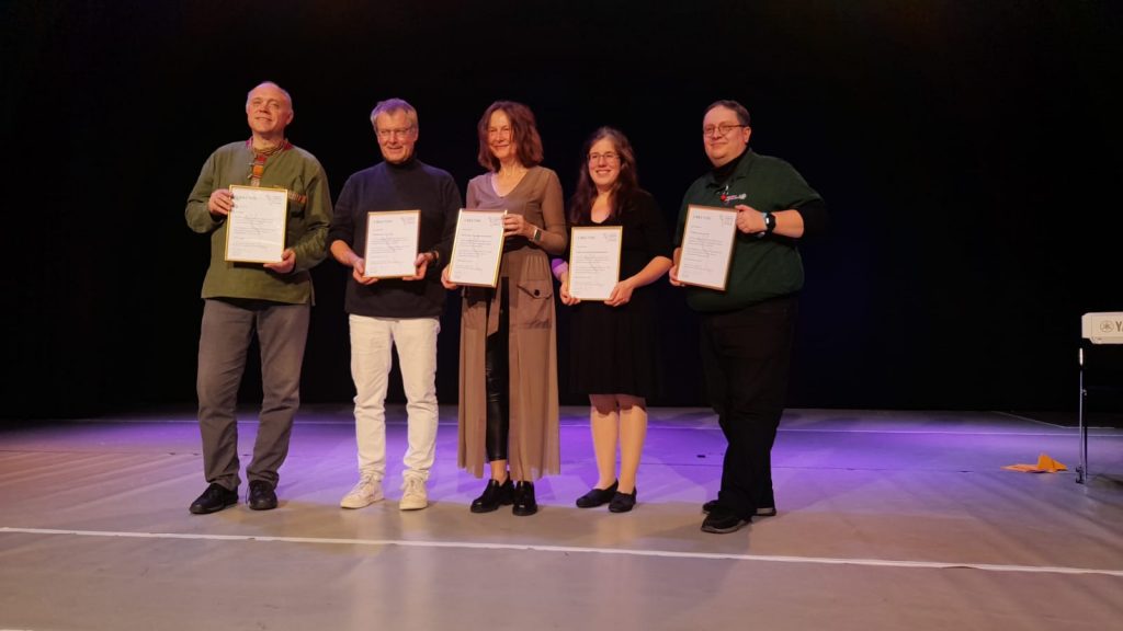Ein Abenteuer, das schon mit der Hinfahrt beginnt. Die Begrüßungsfeier soll um 16 Uhr starten, also brechen wir um 8 Uhr aus. Zeit genug, denken wir, denn die Fahrt soll ca. 6 Stunden dauern. Dann Autobahnsperrung, Umleitung über, für einen Bus, sehr enge Straßen. Ankunft um 16:30 Uhr, die Begrüßungsfeier läuft schon. Wir werden bereits von einer Gruppe von Helfern erwartet, die Ruckzuck unsere Sachen aus dem Bus räumt. Wir schleichen uns in den Saal und sind pünktlich. Denn kaum sitzen wir, wird unser Ensemble vorgestellt.